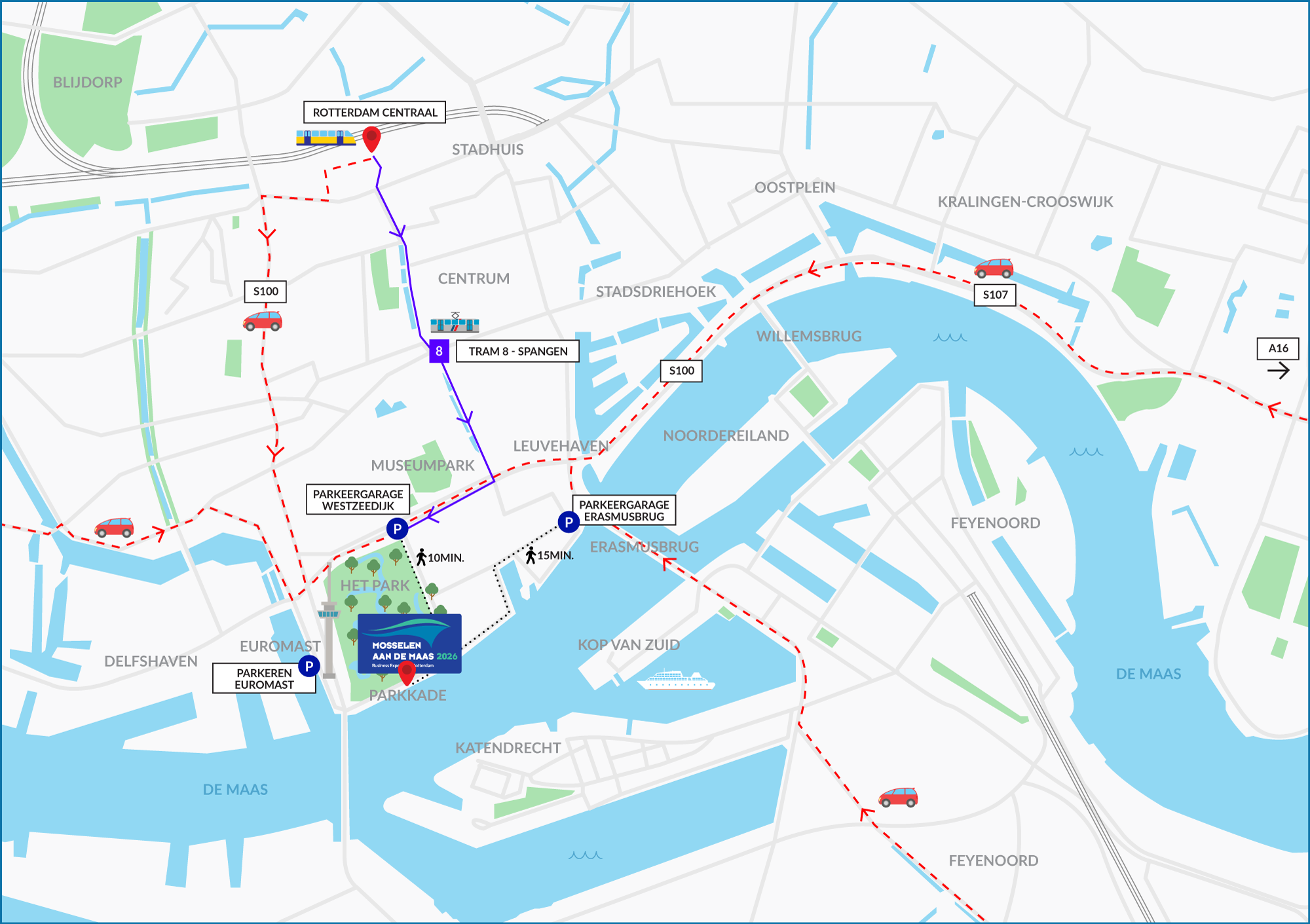 Om reizen van en naar onze imposante eventlocatie op de Parkkade zo comfortabel mogelijk te maken voor onze bezoekers en exposanten, heeft Mosselen aan de Maas voor u een aantal reismogelijkheden in kaart gebracht.